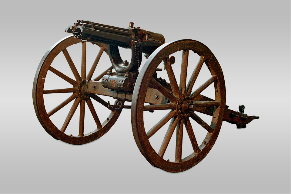 同治十三年前后,加特林机枪输入中国,亦称“格林炮”。此机枪手柄每转动一圈,各枪管依次装 弹、射击、退壳。发射速度可达 350 发 / 分。光绪十年,金陵机器制造局开始仿造。这是中国最早装 备使用的自动枪械。