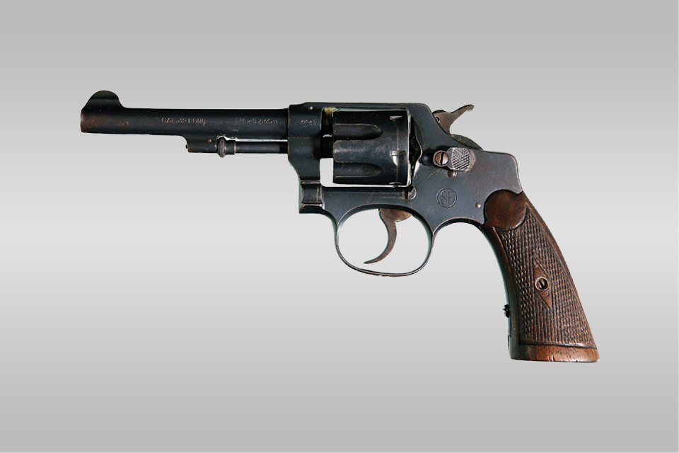 此比利时 0.32 英寸 SF 转轮手枪,原为国民党军一〇九师师长牛元峰佩枪。1935 年 11 月,中央 红军在直罗镇战斗中击毙牛元峰并缴获此手枪。该枪后由左权保存使用。1942 年 5 月 25 日,八路军 副参谋长左权在掩护总部机关及人民群众安全转移时,不幸中弹牺牲,此枪作为左权遗物上交朱德, 朱德将该枪交给作战科长王政柱保存。