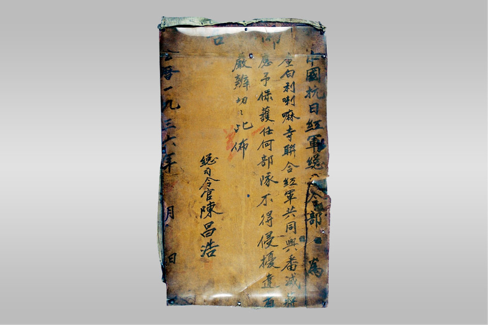 这是 1936 年红四方面军长征经过川西北时, 为尊重藏族地区兄弟民族的宗教信仰,保护喇嘛寺 庙而制作发布的布告。内容为:“中国抗日红军总 司令部 查白利喇嘛寺联合红军共同兴番灭蒋,应予 保护,任何部队不得侵扰,违者严办。切切。此布。