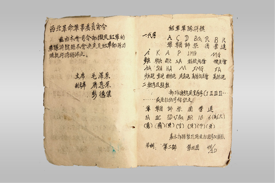 《红军军队符号》由西北军事革命委员会颁布,适用范围是红 军各部。其主要内容有毛泽东、周恩来、彭德怀就颁布红军军队符 号事签署的命令;红军军队符号的代字、数字、号数、队标等。