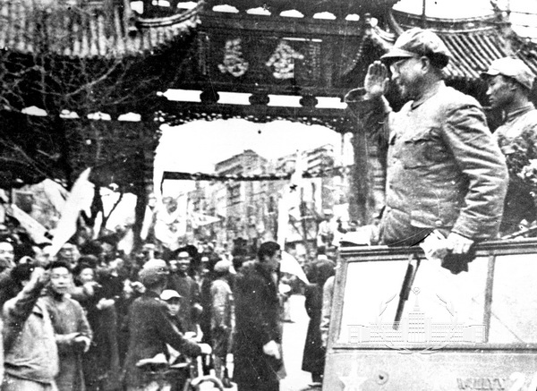 反映中国人民解放军在进军大西南的战役中解放云南省会昆明,举行入城式的情景。第二野战军第四兵团陈赓司令员、宋任穷政委乘坐敞篷汽车,在夹道欢迎中向市民举手敬礼的动作与群众张张欢欣的笑脸形成欢乐喜悦的热烈气氛,表达了云南各族人民欢庆解放,衷心拥戴人民解放军的心情。