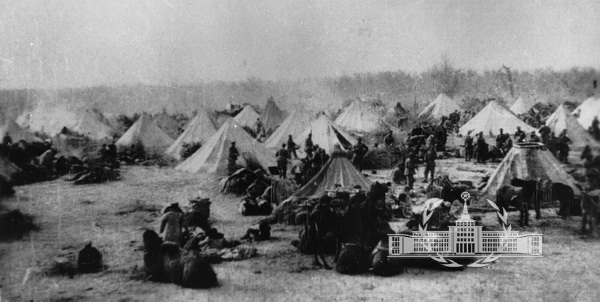 这幅作品展出于1950年“中国人民解放军战绩展览会”,收入《革命战争摄影作品选集》、《老战士摄影》集、《中国人民解放军历史资料图集》。1949年9月下旬,在人民解放军横扫江南残敌,解放兰州、酒泉,向新疆胜利进军的形势下,国民党新疆警备总司令陶峙岳、省主席鲍尔汉等通电起义,新疆遂告和平解放。作品反映第一野战军进军新疆途中,在杳无人烟的茫茫戈壁滩上冒雪支帐篷宿营的情景,展现了人民解放军风餐露宿的艰苦生活和坚韧不拔的革命精神。